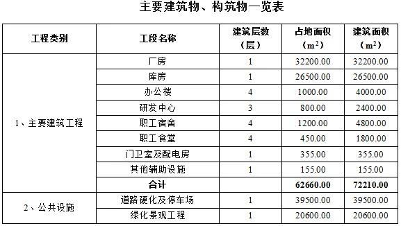 本次建設(shè)項目總用地面積350畝,總建筑面積為72210.00平方米,主要建筑內(nèi)容及規(guī)模如下表: