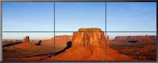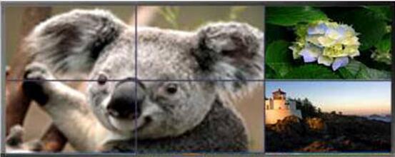 如上圖,每個液晶單元可以單獨顯示一路電腦畫面或監(jiān)控錄像等圖像格式,每個單元顯示的信號可任意切換。組合拼接顯示: