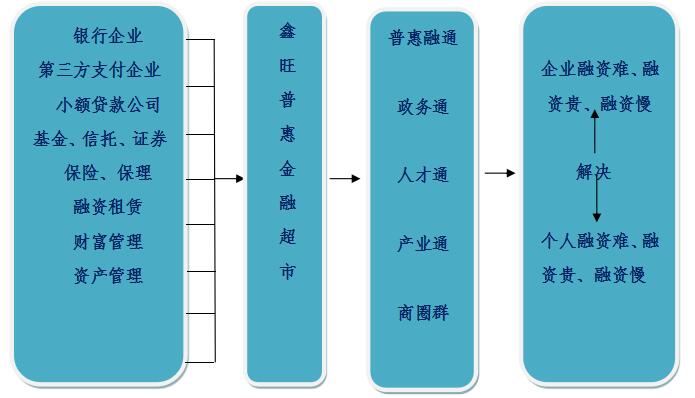 項目模式可簡單闡述為:以山東鑫旺集團為依托,通過(某某市)鑫旺普惠金融超市,整合當?shù)亟鹑跈C構,為當?shù)貍€人、中小企業(yè)提供免費咨詢、培訓、專業(yè)指導、金融貸款產(chǎn)品對接等金融服務,從而解決企業(yè)融資難、融資貴、融資慢難題。最終實現(xiàn)直接盤活地方經(jīng)濟、增加地方稅收、增加地方就業(yè)、等民生問題,并有利于解決地方引進各大行業(yè)專業(yè)人才,提高地方政治、經(jīng)濟地位。