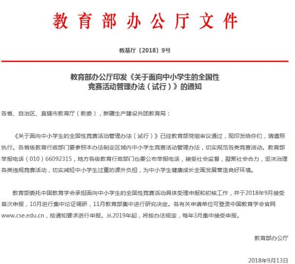 近日,教育部辦公廳印發(fā)文件表示,不得組織中小學(xué)生參加清單之外的冠以“全國”“國家”等字樣面向中小學(xué)生的競賽。在競賽產(chǎn)生的證書顯著位置,要標(biāo)注教育部批準(zhǔn)文號及“不作為中小學(xué)招生入學(xué)依據(jù)”等字樣。...