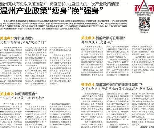 市委市政府印發(fā)《關(guān)于公布市本級產(chǎn)業(yè)政策清理結(jié)果的通知》,公布了150個產(chǎn)業(yè)政策文件清理結(jié)果,上百個政策被修改廢止?!斑@是溫州有史以來范圍最廣、跨度最長、力度最大的一次產(chǎn)業(yè)政策清理。...