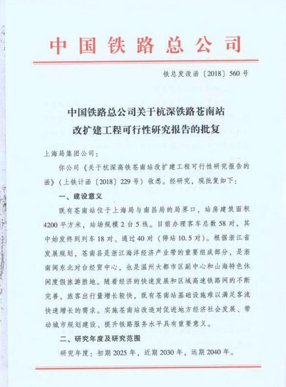 杭深鐵路蒼南站改擴(kuò)建工程可行性研究報告獲中國鐵路總公司批復(fù)