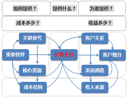 為此,商業(yè)模式一般拆解為九個要素進行分析;其中價值主張統(tǒng)領(lǐng)其他分析,左側(cè)通過關(guān)鍵業(yè)務(wù)、重要伙伴、核心資源,最終分析出成本構(gòu)成;右側(cè)通過客戶細(xì)分、客戶關(guān)系、渠道通路等分析,最終分析出收入來源。最后綜合分析,將最終能分析出商業(yè)模式的可行性。企業(yè)通過對商業(yè)模式中各要素的設(shè)計,將能設(shè)計出能帶來最大利潤空間的商業(yè)模式。