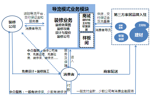 裝修公司導(dǎo)流模式指的是企業(yè)只是作為一個導(dǎo)流及服務(wù)型的平臺,為進駐的設(shè)計師/裝修公司與消費者提供一個交易場所(包括線上商城、線上營銷體系及各類線下活動等),并從其所提供的平臺服務(wù)中賺取服務(wù)費或者傭金。