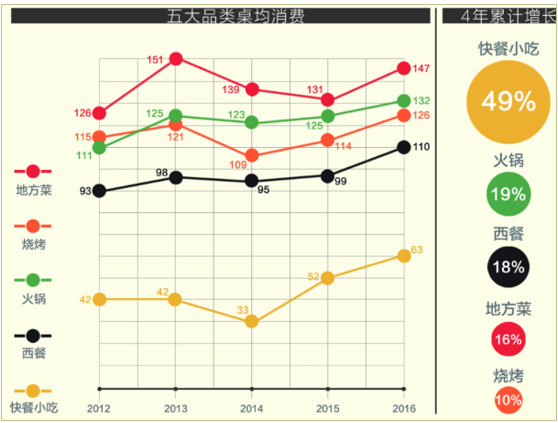 小吃正餐化是長尾品牌化趨勢中最顯著的代表。過去小吃具有鮮明的區(qū)域特征,隨著我國跨區(qū)域的大范圍人口流動和融合,逐漸在全國推廣和滲透,但依然處于極端長尾的狀態(tài)。小吃也是低端餐飲的典型品類,環(huán)境、口味、服務(wù)差異度很高。目前,小吃快餐的人均消費(fèi)提升明顯,4年累計(jì)上升49%。