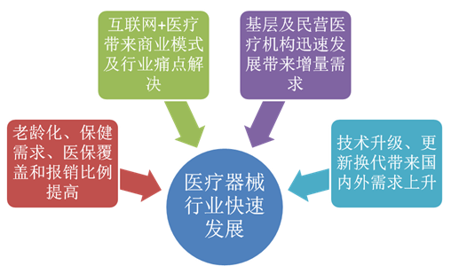 我們認(rèn)為在行業(yè)整合和進(jìn)口替代加速的趨勢下,人口老齡化(保健消費(fèi)需求升級)、互聯(lián)網(wǎng)+醫(yī)療帶來商業(yè)模式及行業(yè)痛點(diǎn)解決、基層及民營機(jī)構(gòu)發(fā)展以及技術(shù)創(chuàng)新升級將是直接拉動醫(yī)療器械行業(yè)加速發(fā)展的四輛馬車。