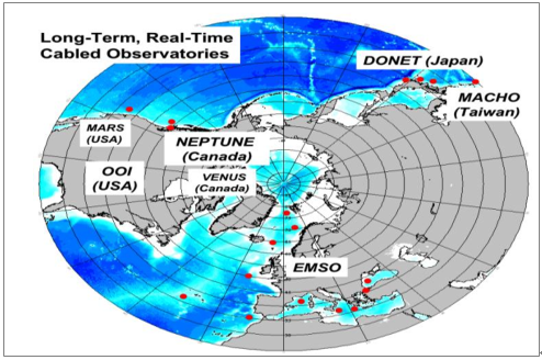 目前世界上已經(jīng)初步建成或在建的較大規(guī)模觀測網(wǎng)主要有:歐洲ESONET/EMSO、美國OOI、加拿大ONC(由VENUS與NEPTUNE組成)、日本DONET、及我國臺灣MACHO等。其中,前三個項目用于海洋探索及多學(xué)科研究,DONET及MACHO項目則主要用以地震監(jiān)測和海嘯預(yù)警。