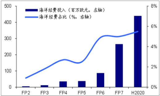 歐盟FP計劃海洋領(lǐng)域經(jīng)費投入情況(百萬歐元)
