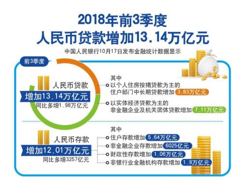 中國人民銀行17日發(fā)布金融統(tǒng)計(jì)數(shù)據(jù)顯示,前3季度人民幣貸款增加13.14萬億元,同比多增1.98萬億元。其中,9月份人民幣貸款增加1.38萬億元。央行數(shù)據(jù)顯示,前3季度人民幣貸款增加13.14萬億元。其中,以個(gè)人住房按揭貸款為主的住戶部門中長期貸款增加3...
