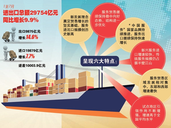1—7月,我國服務(wù)進(jìn)出口保持較快增長。進(jìn)出口總額29754億元(人民幣,下同),同比增長9.9%。其中,出口9875億元,增長14.6%;進(jìn)口19879億元,增長7.7%;逆差10003.9億元。若以美元計(jì),服務(wù)進(jìn)出口、出口和進(jìn)口增速分別為17.2%、22.3%和14.9%。...