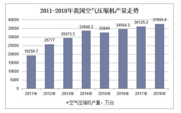 數(shù)據(jù)顯示,2018年我國空氣壓縮機產(chǎn)量為37655.4億元,同比2017年的36125.2億元增長4.2%。