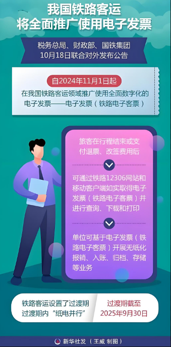 稅務(wù)總局、財(cái)政部、國鐵集團(tuán)18日聯(lián)合對外發(fā)布公告,自2024年11月1日起,在我國鐵路客運(yùn)領(lǐng)域推廣使用全面數(shù)字化的電子發(fā)票——電子發(fā)票(鐵路電子客票)。旅客不再需要打印鐵路車票(紙質(zhì)報(bào)銷憑證),出行和報(bào)銷更便利。...