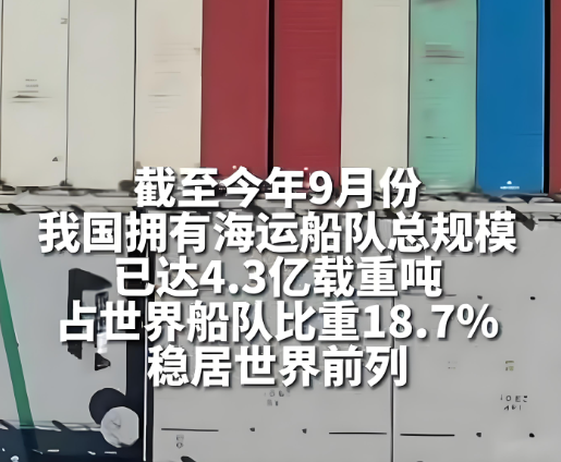 交通運(yùn)輸部水運(yùn)局二級巡視員高海云在會(huì)上表示,截至今年9月份,我國擁有海運(yùn)船隊(duì)總規(guī)模已達(dá)4.3億載重噸,占世界船隊(duì)比重18.7%,穩(wěn)居世界前列。...