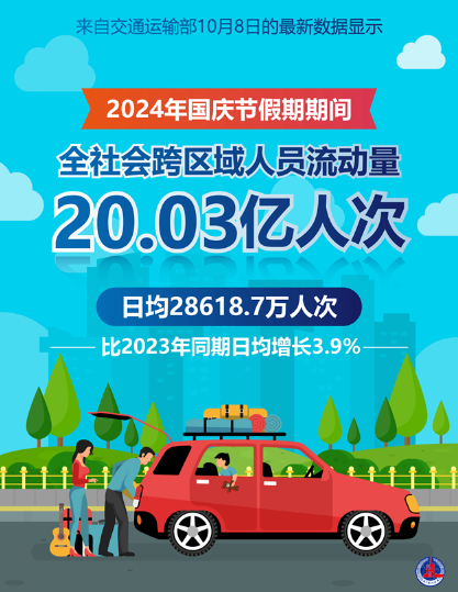 來(lái)自交通運(yùn)輸部8日的最新數(shù)據(jù)顯示,2024年國(guó)慶節(jié)假期期間,全社會(huì)跨區(qū)域人員流動(dòng)量20.03億人次,日均28618.7萬(wàn)人次,比2023年同期日均增長(zhǎng)3.9%。...